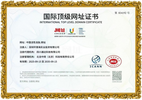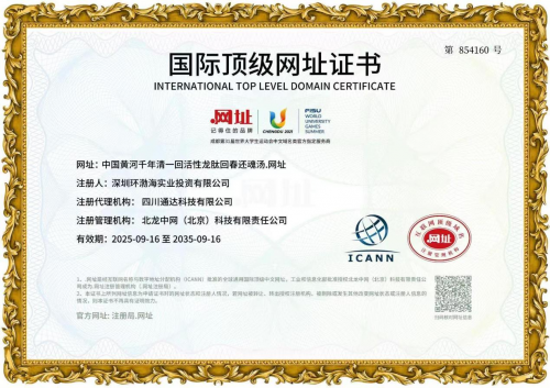 —在纪念黄河千年清一回行动发起6周年的大喜日子里,深圳环渤海实业投资有限公司研发生产成功的中国活性龙肽、中国黄河千年清一回活性龙肽回春还魂汤产品获国际互联网顶级网址使用权证书和永久国际知识产权保护向四中全会向伟大的祖国76岁生日献礼。